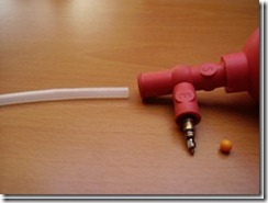 :een plastic leiding zit tussen de peer en het zwembandje om zo de peer verder van het zwembandje te kunnen bevestigen op de tip van de schoen